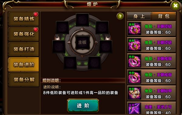 游戏内装备有优良、卓越、完美、传说4个品阶,品阶越高装备的基础属性越高;装备进阶需要消耗同颜色且阶数不高于当前装备的其他装备作为材料。