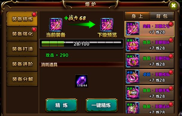 游戏内装备最高可精炼只100级,其中攻击类装备精炼都是加攻击,防御类装备都是加生命的,精炼需要消耗精炼石和少量银币。
