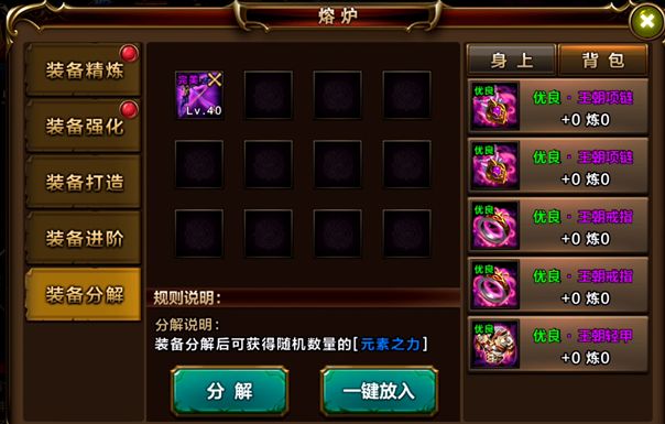 游戏内装备有绿色、蓝色、紫色、橙色4种颜色,为了提高玩家的实力,可以把无用的40级以上的装备拿来分解,分解后可随机获得元素之力,增强坐骑的实力。