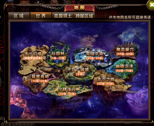 第二个分页就是“世界”,点击世界就会切换到当前亚丁大陆的全貌啦,除了可以告知大家当前自己在哪张地图之外,最有用的功能就是点击地图名称可直接传送至该地图哦,真可谓是一图在手,天下我有。各位冒险者们做任务或者抢头领怪时如果匹配上这个功能会让自己的效率大大加倍哦。