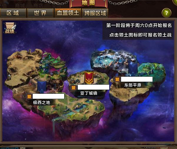 第三个分页就是“血盟领土”,点击血盟领土就会切换到当前三个占据领地的盟名,可以告诉玩家目前哪些领土是由哪个盟控制,点击领土可看到盟的总战力,此时可以对比自己盟的战力,预估周六日的领土战能否胜利打败其他盟,成为亚丁城镇的统治者!