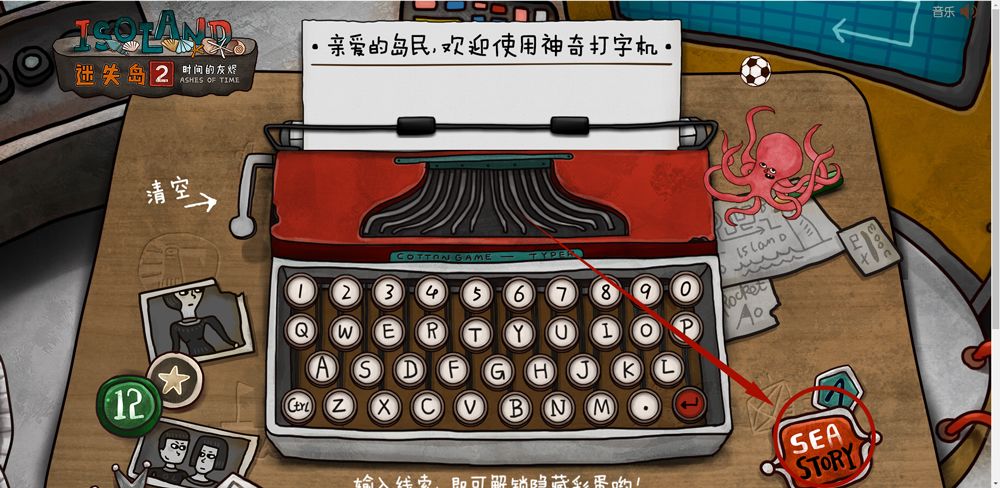 点击打字机页面 - sea story,出现顶着足球的章鱼