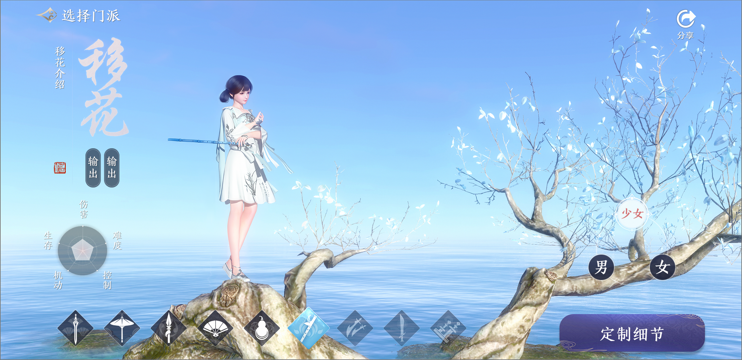 玉笛临风,醉心入梦;红尘移花归去,沧海踏歌而来。在下次测试中,全新门派“移花”将正式登场。移花乃东海子桑氏开创的门派,中原移花亦出自东海一脉。千年之来遗世独立,是八荒之中最为出尘风雅,写意逍遥之门派。