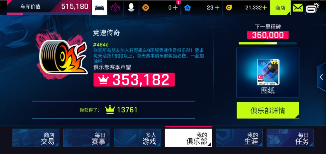 竞速传奇俱乐部收人,日活跃1500且每日赛事俱乐部奖励必打。
