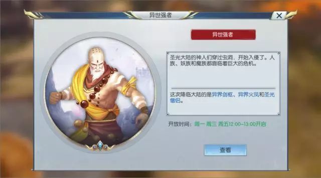新版本上线后,异世强者将于每周一、周三、周五12:00-13:00开放,道友们可别错过啦。