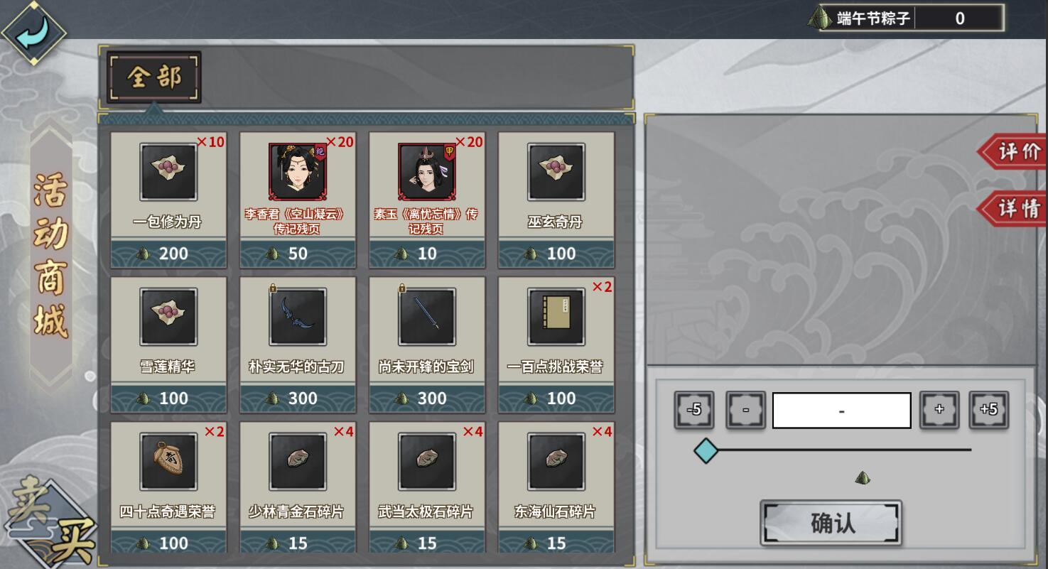 答对屈心姑娘的问题即可获取端午节粽子,可在活动期间前往端午活动商城兑换各类活动道具,包含修为丹、李香君《空山凝云》传记残页,素玉《离忧忘情》传记残页、挑战荣誉、奇遇荣誉和特殊装备哦!