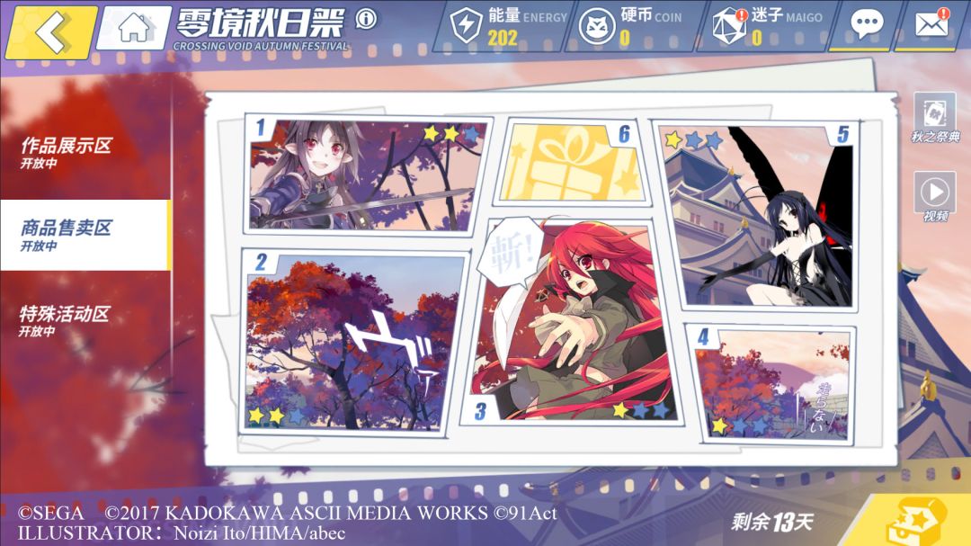 零境秋日祭共分为三个章节:「作品展示区」、「商品售卖区」和「特殊活动区」。每个章节分为5个主线关卡+1个奖励关卡,最低可消耗6点能量(特别关卡除外)挑战关卡,可启用超能模式。
