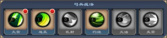 弓兵:火箭、连赢、乱射、灼烧、火油、炎箭