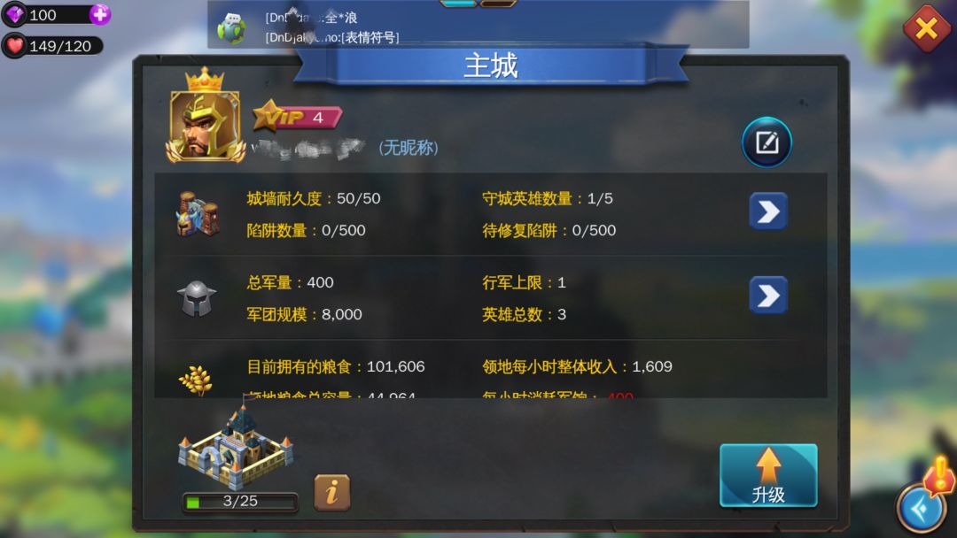 游戏中等级是十分重要的,最主要的是主城等级和统御等级。