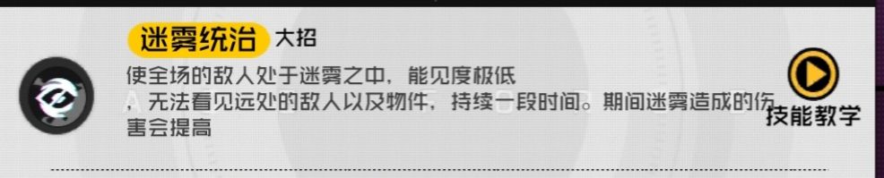 大招:迷雾统治释放后敌人的视野范围会大幅度降低,能够对敌方透视和侦查造成影响(但在一定距离内还是能够被透视)并且会稍微影响辅助瞄准。