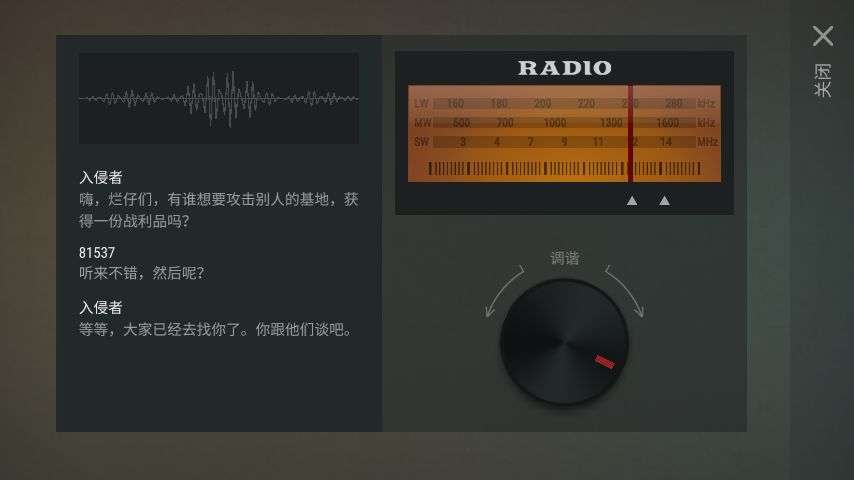 你所用的发射器则是无线电,是我则先接收到的,我是“传播者”里的一和平主义者,你一定要切记!不要回答!如果回答,传播组织将会检测到互通信息,阻截的无线电会继续传播!如果被其他幸存者接收到。那么,双方基地坐标将会暴露,俩方必会互相伤害!但是因为是我先接收到的,只要不回答,你基地方圆的地理位置将是你最好的掩体!切记!不要回答!不要回答!不要回答!