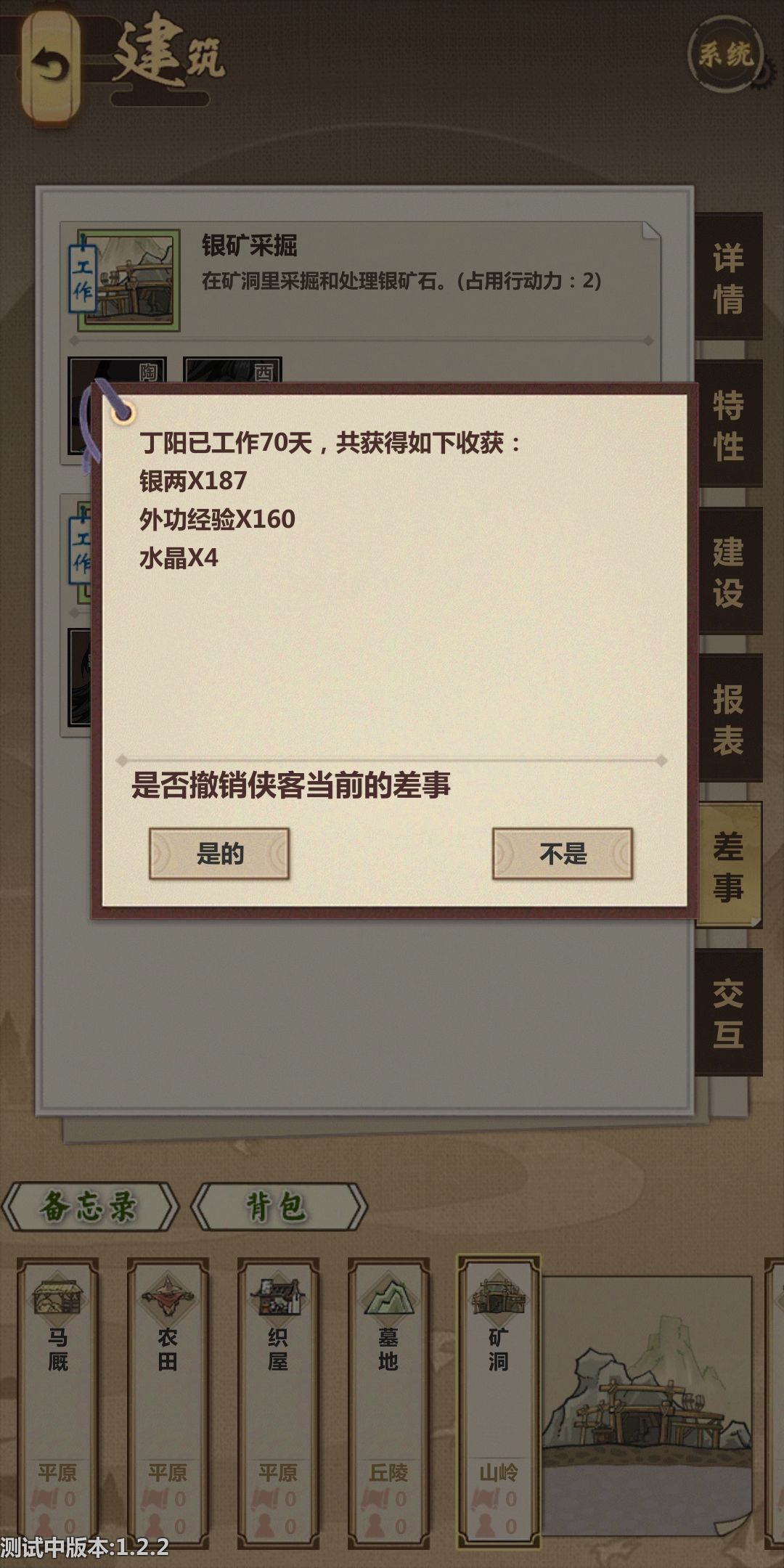 建议在管理里面增加差事选项,并且在差事界面点击弟子出现详情和撤销差事界面,点撤销再出现下面的界面,不然我就想看看这个差事的人合不合适还得记名字然后到侠客里面找,太烦了