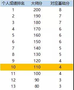 单场赛事基础分=单赛事排名对应的大师分*4%