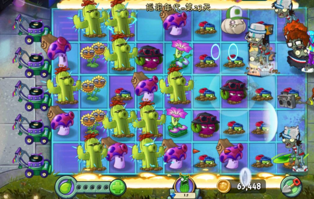2.摇滚(Pop) :此音乐会使僵尸移动速度比正常速度减慢两倍,同时闪动僵尸放出绚丽的彩虹,彩虹可以保护后面所有的僵尸不受任何伤害及异常状态的影响(但是一行中有多个闪动僵尸时效果无法叠加)。同时,她不必啃食植物,而是直接用旱冰鞋踩踏所遇到的植物。 播放此音乐时,草坪上方会出现迪斯科球和霓虹灯光,同时草坪上会亮起小灯。
