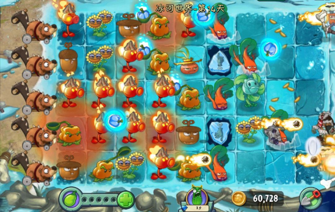 世界特点:1.寒风凛冽:场地上会随机刮起凛冽的寒风,受到影响的植物会附加一层冰冻层数,当冰冻层数达到三层,该植物即被冰冻,变成一个会阻挡平行射击攻击的大冰块。火炬树桩、火焰豌豆射手、辣椒投手、岩浆番石榴、火柴花拳手和火焰花女王等植物可散发出热量消除一层冰冻层数或使冰块消融一部分。(烤马铃薯也可直接融化冰块)