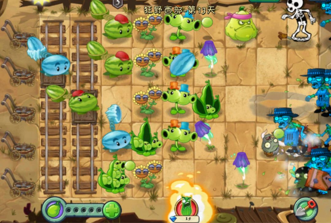 世界特点:轨道矿车:场地上安置有一条或多条轨道,每条轨道上均有一辆可移动的矿车。玩家可将植物种植在矿车上并变换位置来攻击位于不同行的僵尸。(注意竹笋不能种在矿车上)