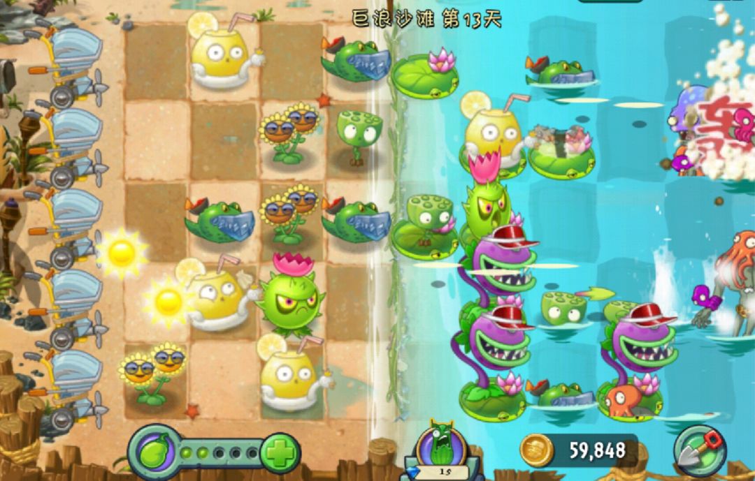 世界特点:水路:巨浪沙滩中具有涨潮线,潮水只会淹没涨潮线右边的场地。在水中无法种植陆生植物,需要先种植莲叶,才能将陆生植物种植到水面上。(水生植物和空中植物可以直接种入水中)