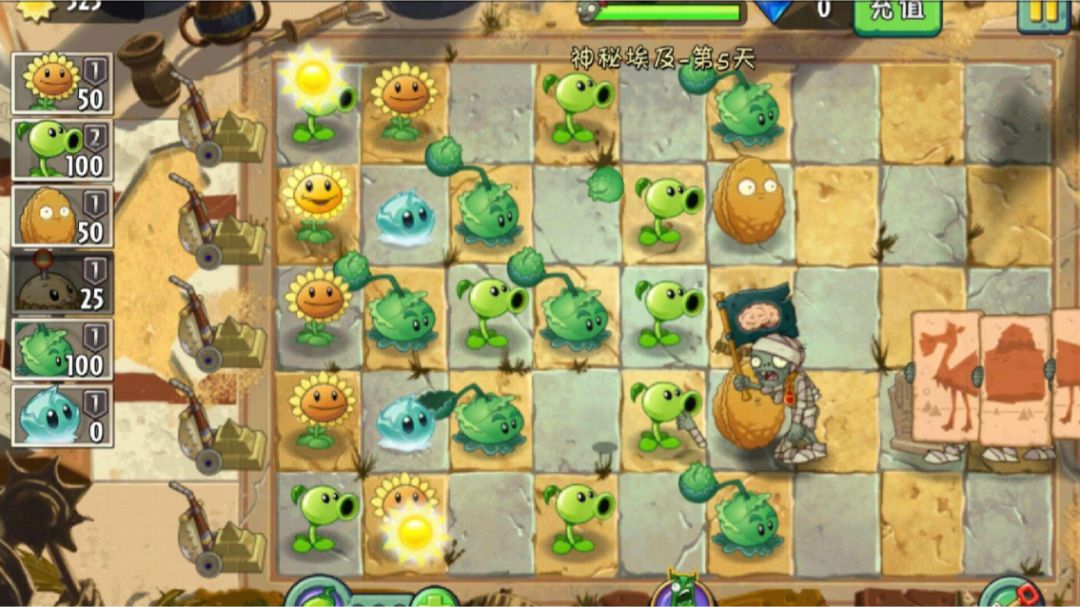 2.埃及墓碑:场地上会出现一个或多个墓碑,墓碑可以被植物的攻击摧毁,被摧毁前会阻挡平行射击的子弹,投手类植物可越过。(墓碑的产生主要是由死神僵尸和埃及僵王博士的导弹制造)