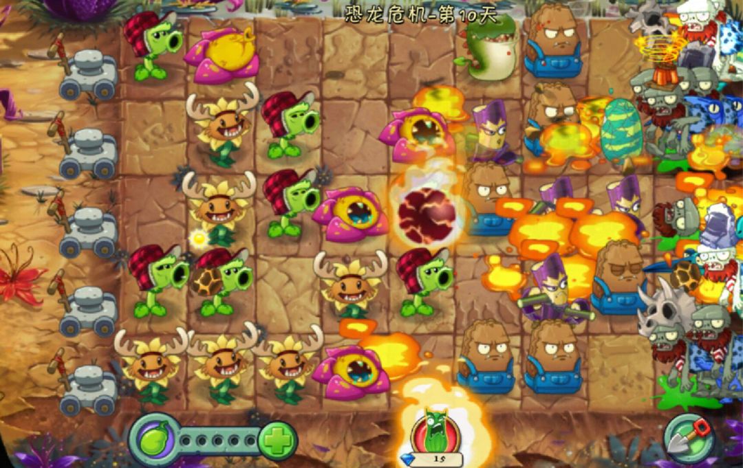 2.机关陷阱:①巨石阵:将植物种植在巨石地砖上可触发巨石陷阱,碾压三列所有阶数的植物和僵尸。②火焰陷阱:在火焰地砖上可触发火焰陷阱,烧光一整行的植物或僵尸。