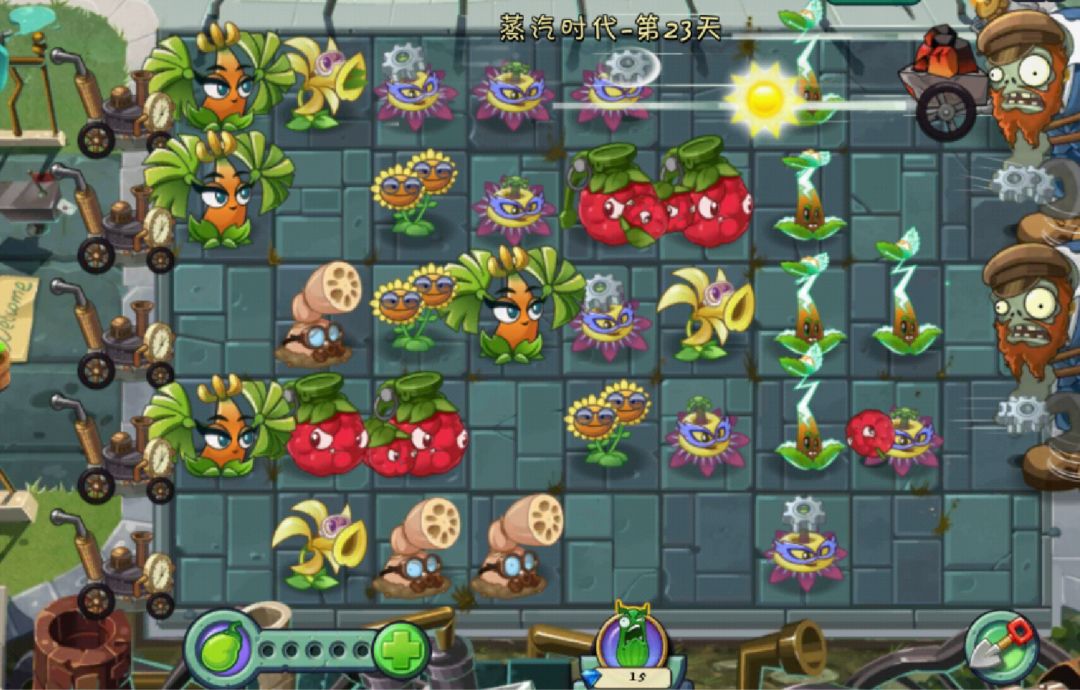 世界特点:1.喷发的下水道 :蒸汽时代里将会出现漫天的毒雾,毒雾从喷发的下水道中散发出来,毒雾不仅会遮挡住僵尸的身影,让僵尸们可以悄无声息的逼近植物,还会对种在毒雾里的植物造成持续性伤害。三叶草和飓风甘蓝可以吹走毒雾,平顶菇也可以堵住下水道。