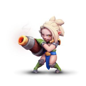 身为精灵公主却从小喜欢玩弄枪炮。自制的大炮能发**灵魔法,震的别人东倒西歪,造成穿透伤害。不过爱尔常常也会炸到自己人,所以大家都远远的躲着她。