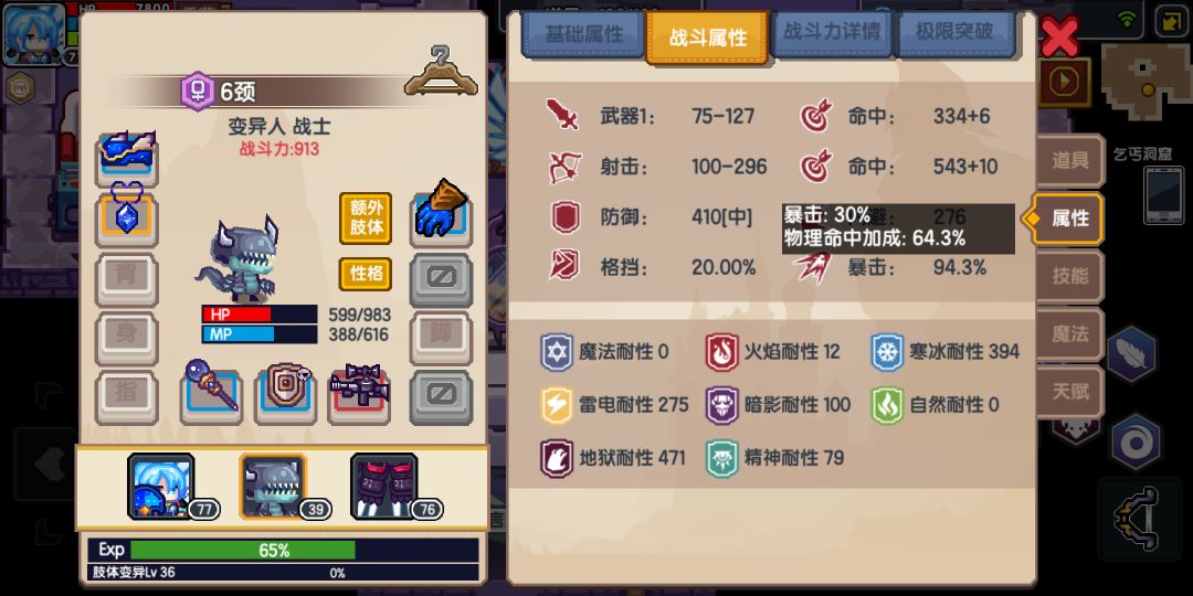 战斗属性界面可见,每把武器都有命中数值a+b+c