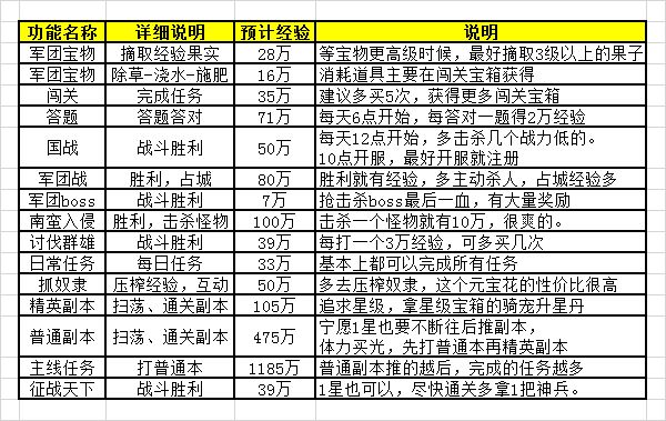 15级军衔;20级军团科技;25级宝物;26级神兵,30级装备洗练,40级战宠,功能开放后都能获得大量属性加成。
