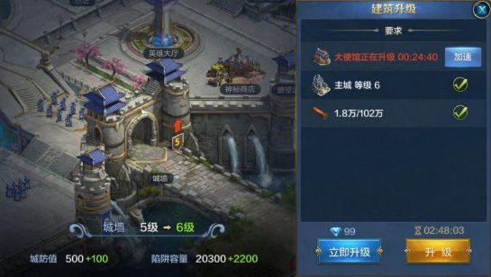 学院可以研究科技,给主君们的内政、军事、防御等方面给予帮助;大使馆是主君们的联盟入口,从大使馆里面可以查探到自己的联盟的消息;军营是主君们国家的军事发展中心,在军营里面可以训练士兵,可以进阶士兵,本国的部队军事力量主要从此而来;治愈圣所用来治疗受伤和士兵和英雄;城墙用来防御其他国家的进攻,给城市提供了保护罩;仓库则是用来储存主君们自己城市里的基础资源,可以开发地窖,避免城市被攻击时基础资源被敌人抢夺。这些建筑的升级与主城都息息相关,升级这些建筑也是需要一定的基础材料,等级越高,所需要的木材和粮食也就越多,到一定等级时,升级建筑还需要大量的石头资源。