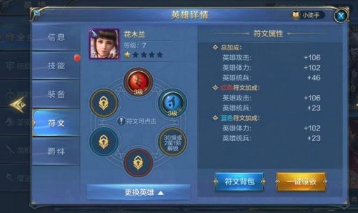 当各位主君的英雄等级达到25级或者1星2阶即可镶嵌第一颗和第二颗符文,当英雄等级达到30级或者2星1阶即可镶嵌第三颗和第四颗符文,以此类推。每个英雄最多镶嵌6颗符文,红蓝黄各2颗。符文镶嵌给英雄后会大大增加英雄的属性,增加英雄的战斗力。红色符文主要加持英雄的攻击力属性,可以额外附带属性;蓝色符文主要加持英雄的体力属性,也可以额外附带属性;黄色符文则是可以加持防御属性,也可附带额外属性。符文可以升级,当各位主君想往英雄身上镶嵌高等级的符文时,可以点开英雄的符文页面,点击升级的按钮,高等级的符文都是由低等级的符文合成而来。1颗2级符文需要3颗1级符文合成;1颗3级符文需要3颗2级符文合成;1颗4级符文需要3颗3级符文合成...以此类推。所以说,越高级符文所消耗的低级符文材料就越多,但是相对应所加成的英雄属性也就越高,各位主君一定要按照自己的财力来给英雄镶嵌符文哦。
