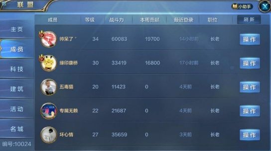 在联盟的成员一栏,各位主君可以查探到自己联盟成员的一些基本信息。比如,盟主是哪位好汉,副盟主又是哪位好汉,自己的捐献值又有多少等等,在这里各位主君可以找到志同道合的小伙伴,一起游戏那岂不是美滋滋。