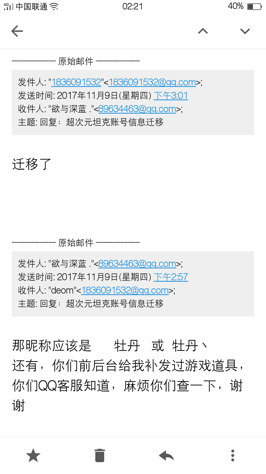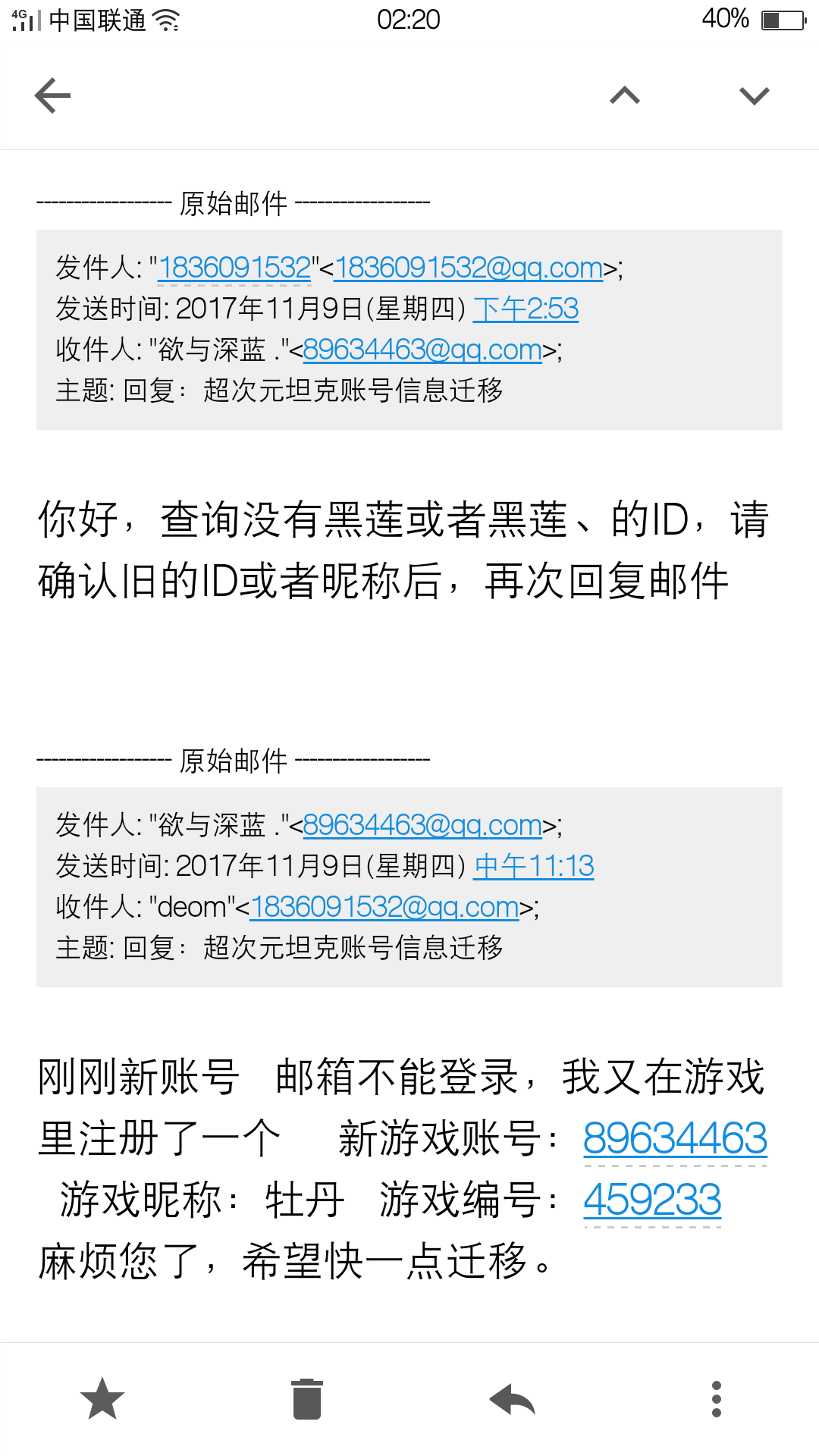 以前迁移数据那时候弄过一次,然后一段时间比较忙,再回来提示不支持此版本,请从新下载,可是下载了新版账号密码就不对了,一找回密码就是手机号,可是当时是用账号登录的,(可能是多玩版本,找到半夜这个点也没找到多玩的版本)真的是。。。心血在里面啊,也充了钱,哎,不知道还能不能找回来。上次数据迁移的账号 89634463 游戏编号 459233 游戏名字是牡丹,希望官方能帮助下,上次迁移记录还有,发给你们看下,现在邮箱是不理我了,呵呵