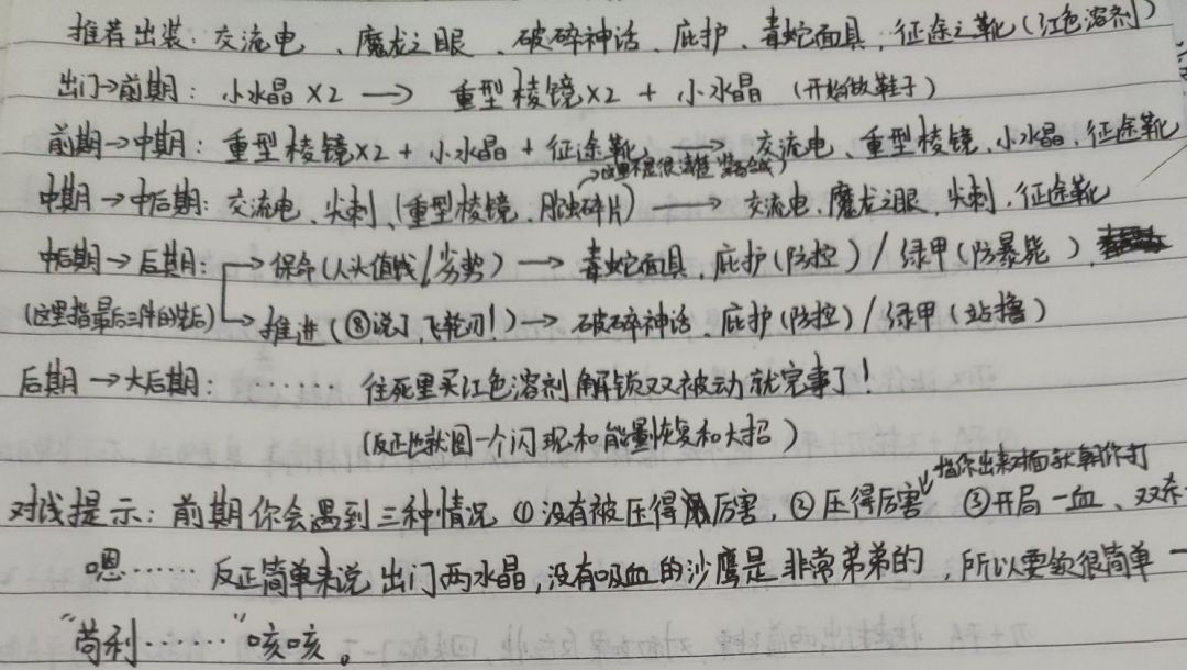 建议出装顺序为:交流电 征途靴 魔龙之眼 毒蛇面具 物理溶剂 法穿刀 休憩盔甲(注意:该出装通过溶剂达到非永久的双被动状态,请自行把握经济的使用和双被动解锁的节奏)