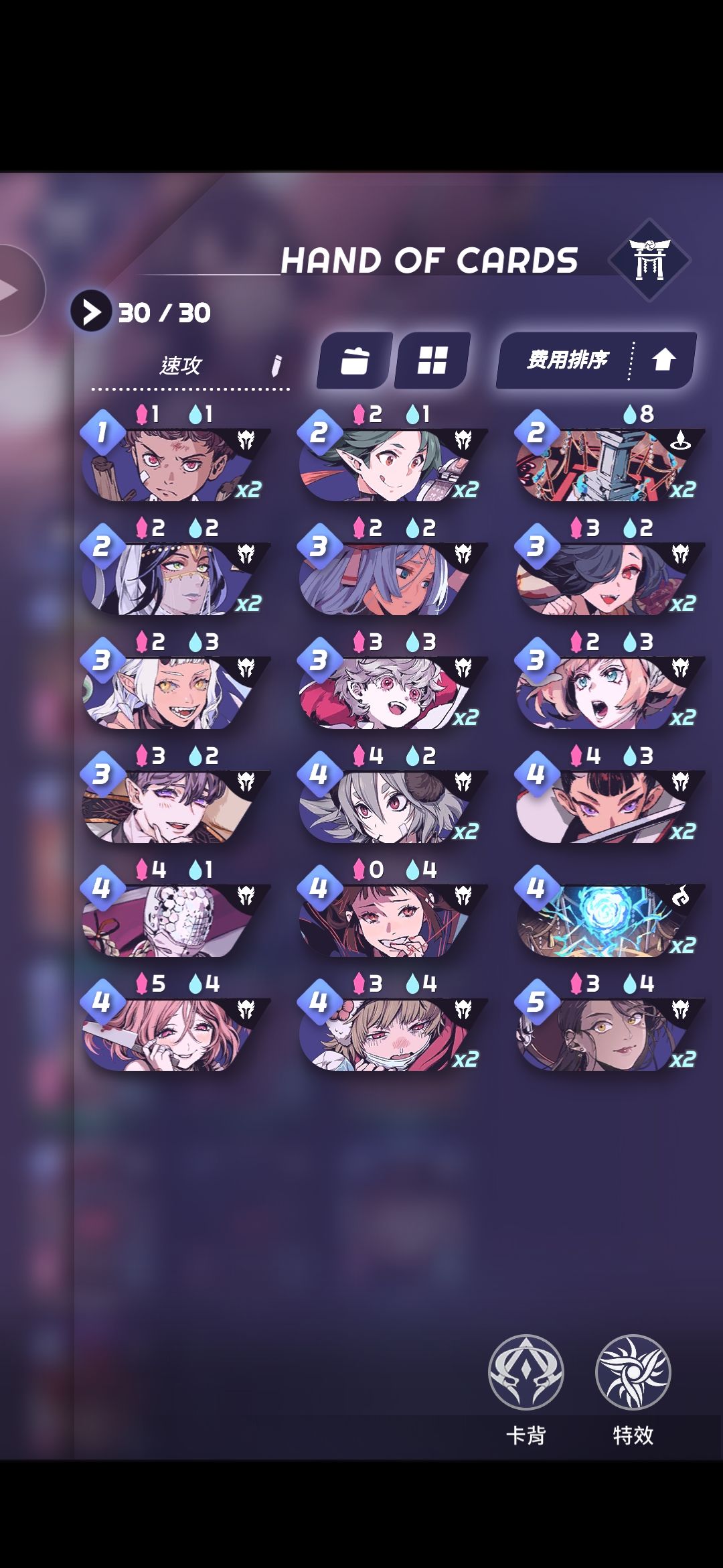 本卡组不追求1c下怪,开局一手有2费留2费,没有2费留一张3费,换完牌之后如果没有2费也没有3费就抽牌,有3费就开技能,注意不要被白嫖。 由于是棋盘类型,所以这个游戏的随从非常灵活,对面贴脸下怪,可以讲君主退后一格,在中间放置不可杀,或者在斜边放置希拉。 在保持节奏的情况下解场打脸,尽可能把费用打满。桥姬记得贴脸盖牌,要放置在没有对面随从的一边,避免不必要的尴尬(距离不够a不出去或者被盖着打死)。 一般来说该对战不会超过7个回合。