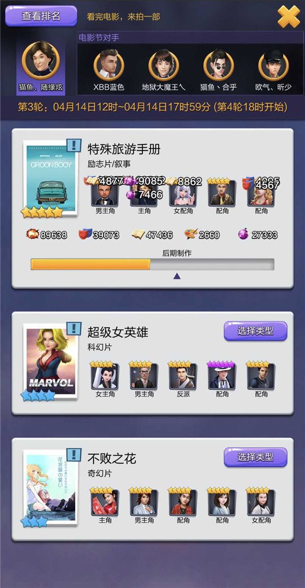 每周六的0:00,上线后玩家朋友消耗一张拍摄券(购买门票)进入电影节,此时影业协会会为每一位玩家匹配4个对手,从而建立起一个5人的PK小组。