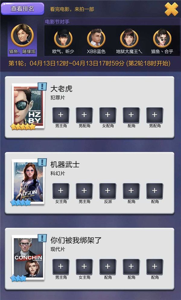 接着我们进入到电影节拍摄界面,每一轮比赛均有三部电影需要完成拍摄。这里Chen教给大家一个小技巧,在进行电影节影片拍摄时,请不要一部一部的按次序进行拍摄。而是直接“点击”三部影片的开拍并进入到每一部影片的人物选择当中去(如下图所示)。