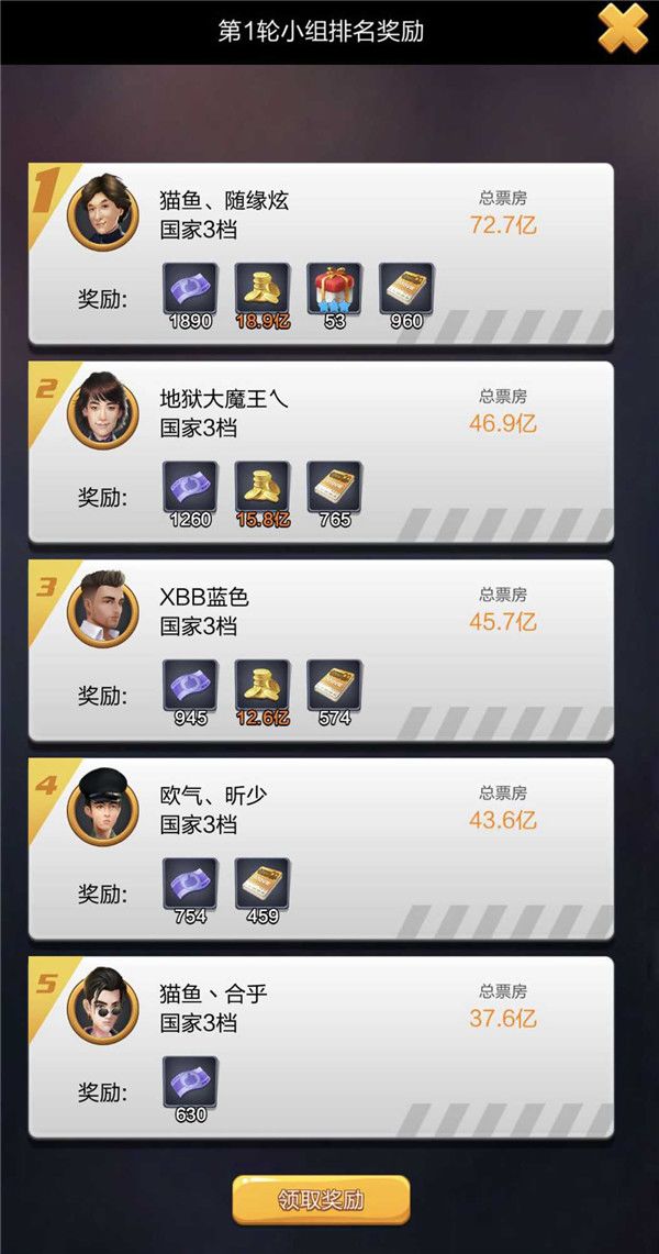 如上图所示,处于国家3档的佛系炫,每轮竞赛分组排名能够达到第一名的话,将会给与1890热映好评券+18.9亿金币+53个三星资产礼盒+960宣传册的丰厚大奖。而第二到第五名也依然会获取好评券等奖励,只不过数量上会遭遇滑铁卢般的衰减。