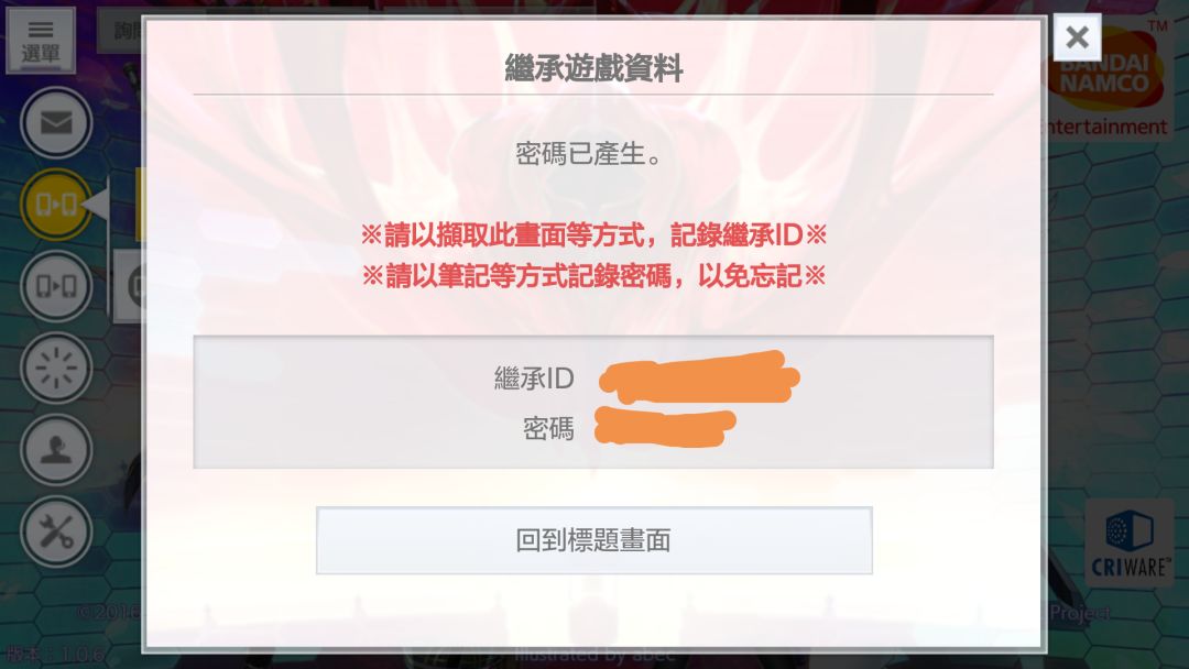 Roy在tap上看到许多同学问我如何继承,今天就告诉大家继承的方法(`Δ´)ゞ 首先,打开游戏 之后点击左上角方块  点击第二个选项  弹出界面,这时请注意,这这个代码要记住,然后,你可以自己设置一个密码输入上。我建议你们截屏,最保险。  之后会弹出成功画面,关了就行了,如果想要再上这个号,点击第三个选项  将上述两个密码对应输入即可  会一开始弹出这个界面,就是点击的时侯, 之后你可以卸载游戏,重装一遍,就可以刷初始了,原来的账号也可以再上。 如果大家有更好的方法,欢迎留言 你的支持就是我最大的鼓励 ——Roy