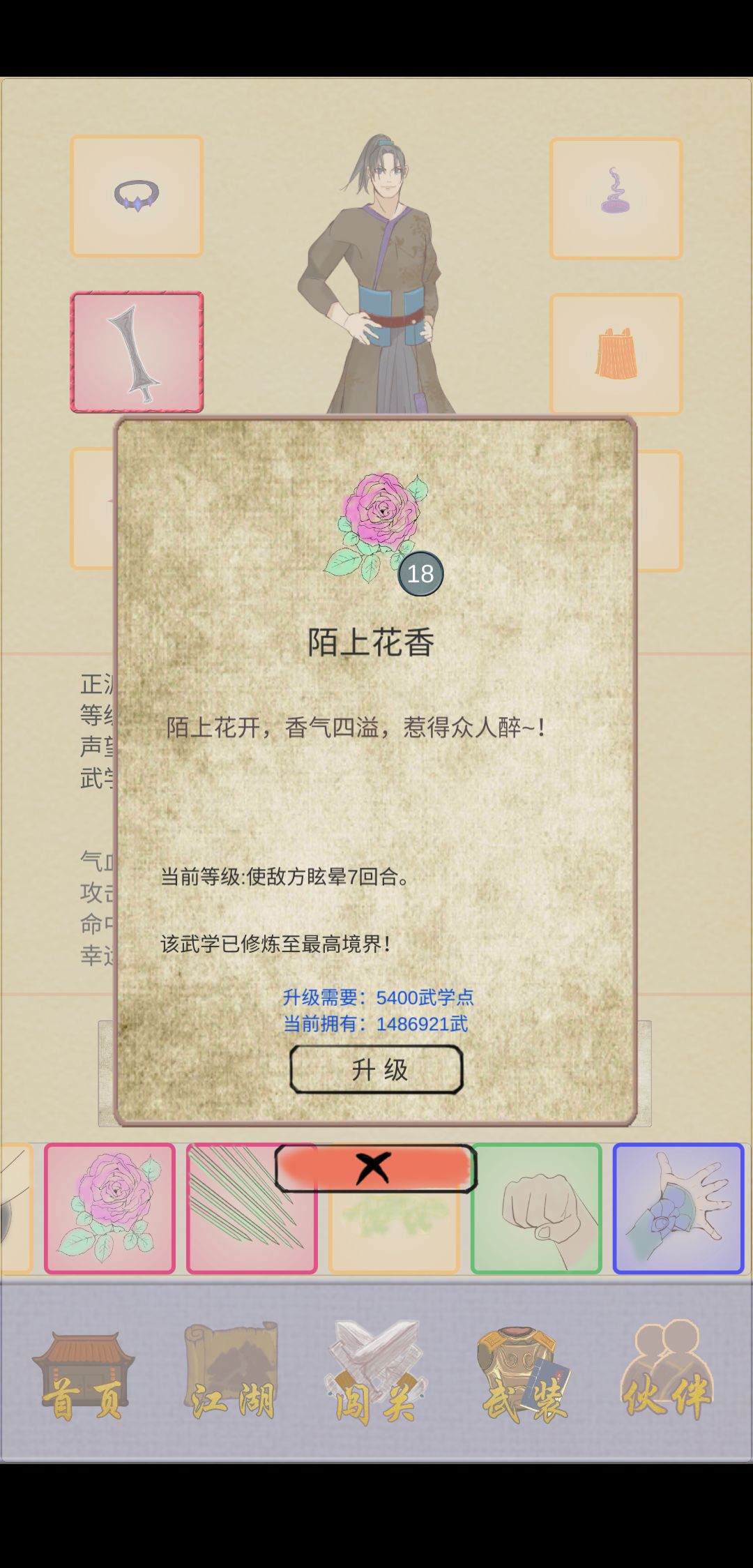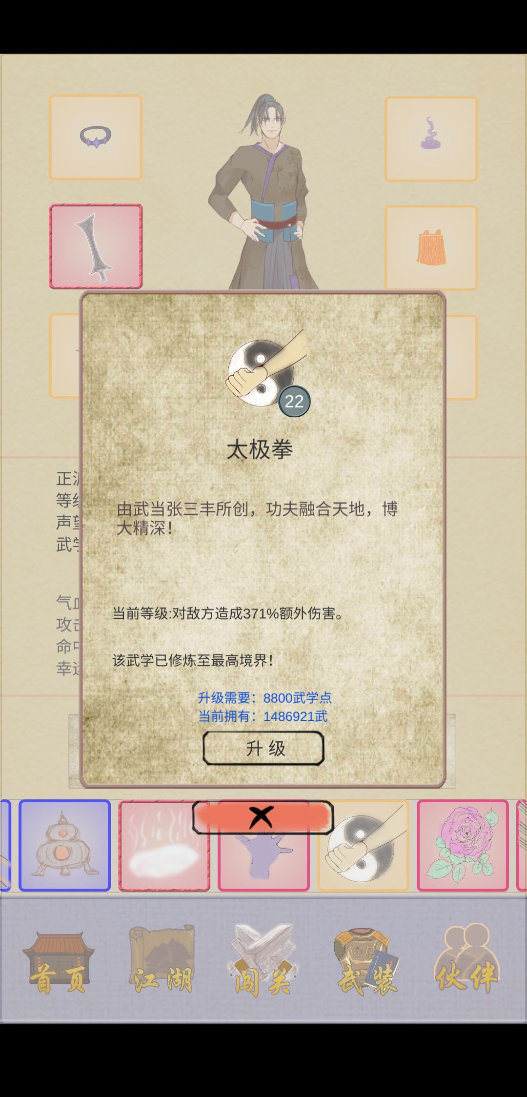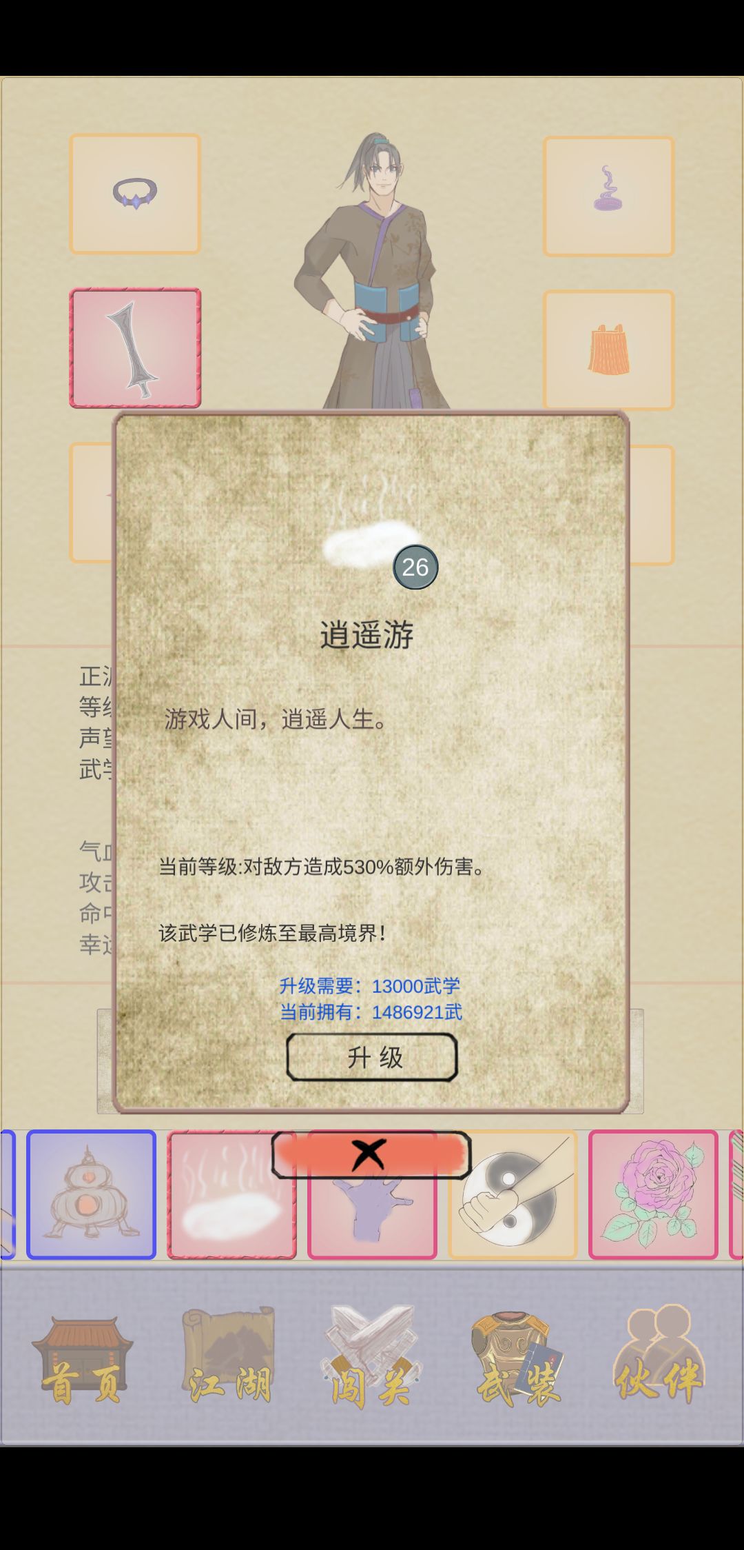 接着全图单攻最高 逍遥游(530%加成,26级最高),亲测伤害比太极拳高(371%加成,22级最高