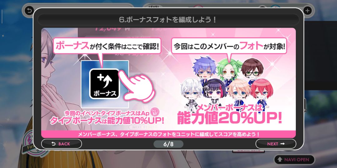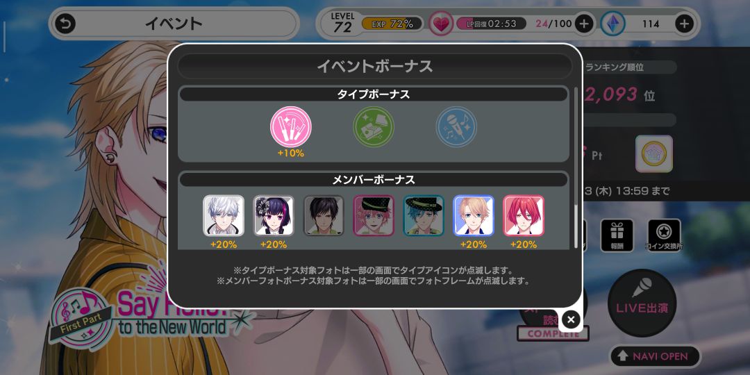举个例子,像这次活动的加成就是AP(红)卡数值+10%,北门,竜持,和南,momo(头像亮着的人物)数值+20%