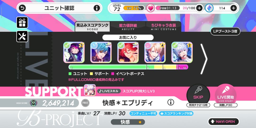 而且在歌曲准备页面,bpro也亲切的为我们标出了活动加成的预估得分,也就是下图紫色部分。