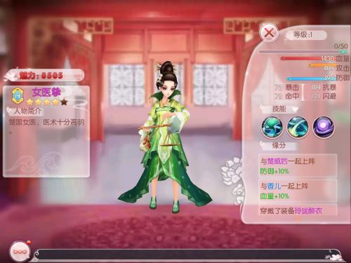 卫良人是为数不多的AOE蓝装随从,获取方式同样由系统升级获取。虽然面板比不上橙装的孝庄太后,但是主动技能【莲华】也能对敌方前排造成AOE伤害,且为本方后排增加攻击,算是性价比较高的蓝装随从。建议在过渡期使用卫良人,等待获取更强力的随从之后,再替换下来。