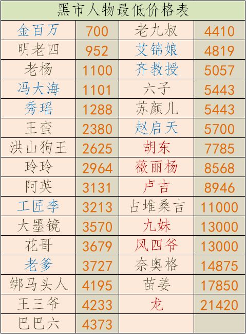 都要五一了还没有开学……闲着无聊又做了个人物最低价格表(不一定非要刷出最低价格才能买,重要人物贵10%也无所谓的,早买早享受),红名的是探墓主力,蓝名的有特殊作用,其他的大都是被压榨剥削的矿工(这个表只是作为参考,如果遇到了更低价格欢迎提供截图)。
