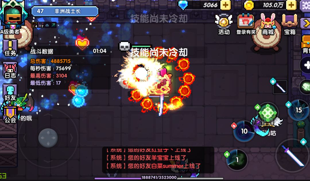 先从我的思路开始吧,我的思路是利用高hit触发武器特效来产生输出,贴脸站桩轻松打boss,现在游戏时间为第10天,A勇者,没去打70以上,为了这几天刷钥匙,靠刷钥匙我才能10天出5星武器,这是今天刚出武器后就测试效果了