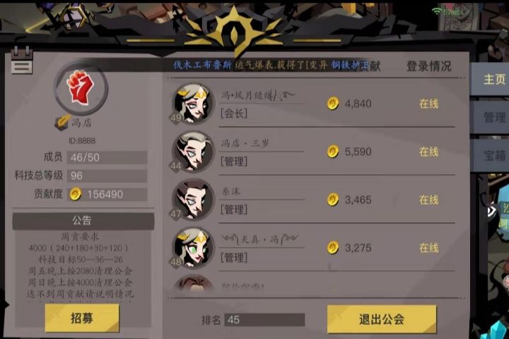 96级科技公会招人,ID8888,周贡献要求4000,每周五周日踢一次人,欢迎新老玩家加入,最好是长期玩家,不轻易退游。可加vx:hyz44444进群,群内气氛活跃。 另:一定要看公告,能加群最好。这周还有四个位置,欢迎加入(ID8888,如此吉利,怎能不来👀)科技目前:34 36 26.公会剑盾玩家不少,组队不用愁