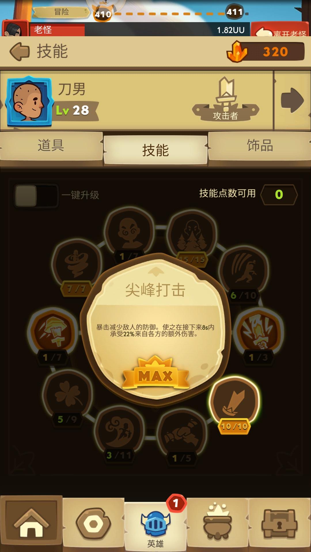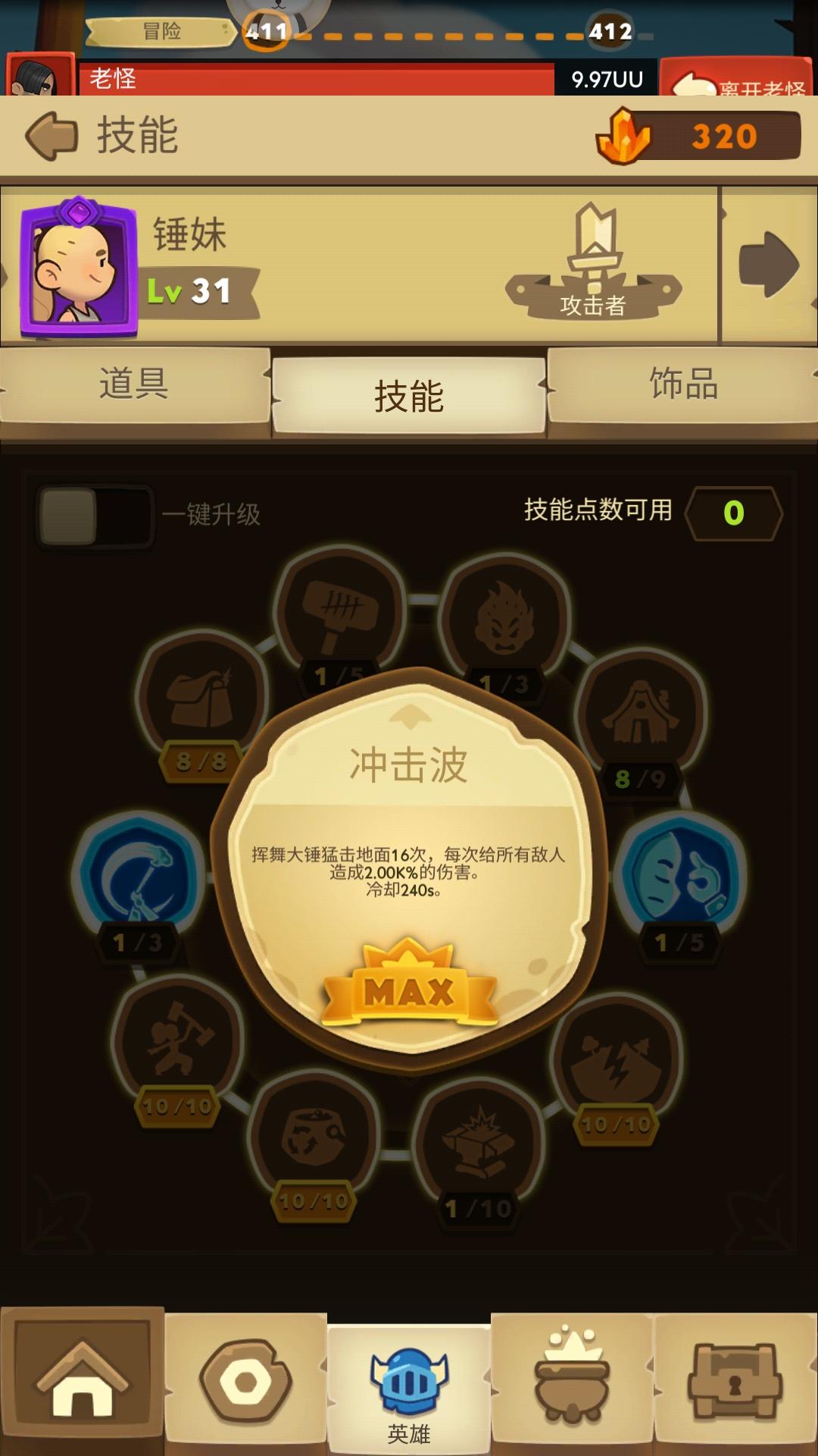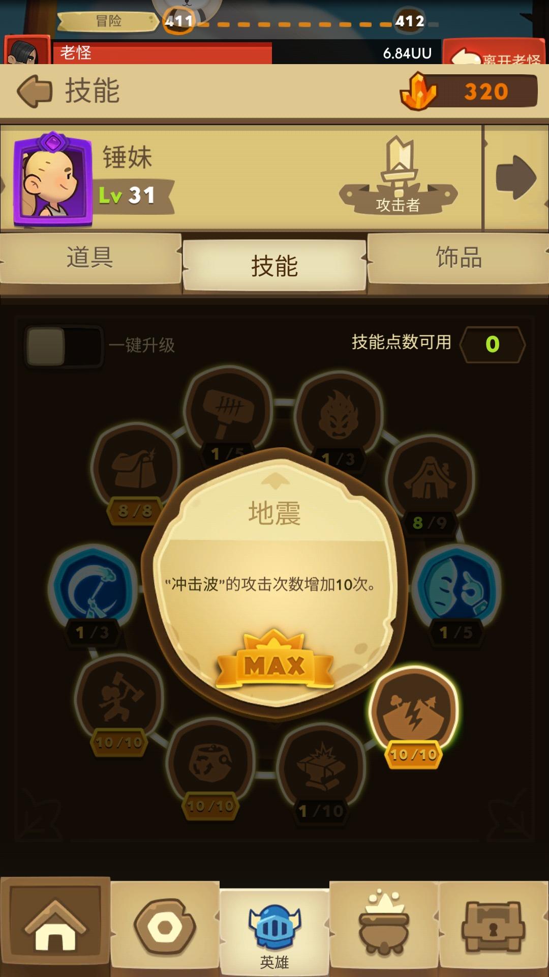 而且关于捶妹的加点,是这样的,先直接留点点满减耗,金币不急点满,减耗出来以后再金币,如果进度还比较前面的话,金币实际都可以不用点满,如果进度比较前面的,把点平均分给地震和冲击波,后面如果推到中期,先满冲击波,再点几点地震