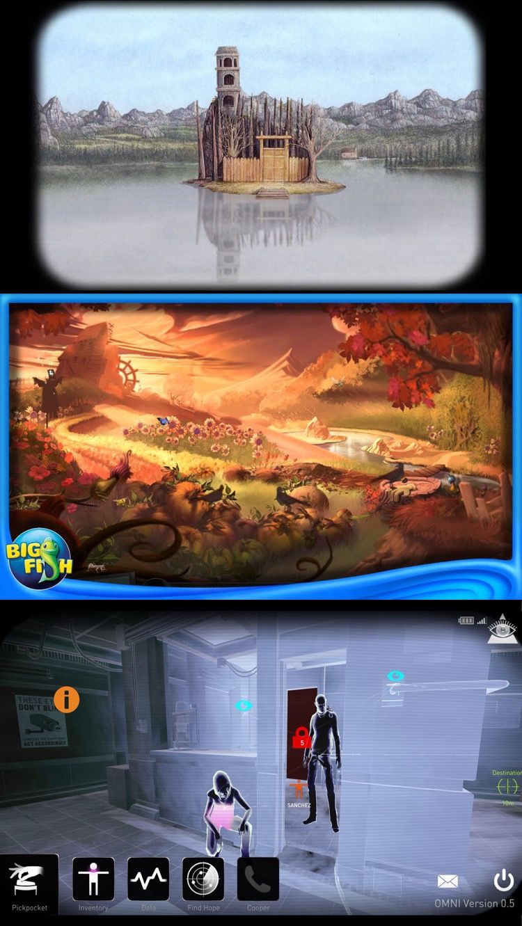 第二类是地图不局限于密室而是拥有更广大的世界构架的逃脱解谜。有三家公司做的比较出色:G5 Entertainment AB,Artifex Mundi S.A.和Big Fish Games(大鱼)。每家公司都有一系列数量众多的逃脱游戏,玩法和画风都相类似,差别在于场景和剧情,但游戏的质量都非常有保障。其中以大鱼最为出色,大鱼的谜画之塔神秘视线阿扎达等系列是众多人的经典回忆,无论画风,谜题的设置还是剧情各方面都值得推荐!