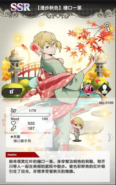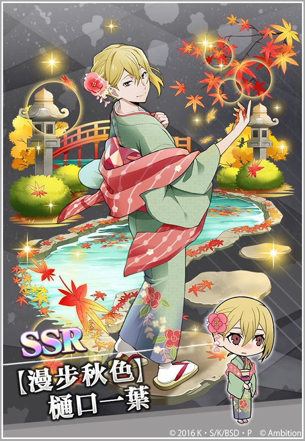 前来观赏红叶的樋口一葉。身穿整洁明艳的和服,和芥川等人一起在美丽的庭院中散步。被色彩鲜艳的红叶吸引住了目光,尽情享受着秋天的情趣。