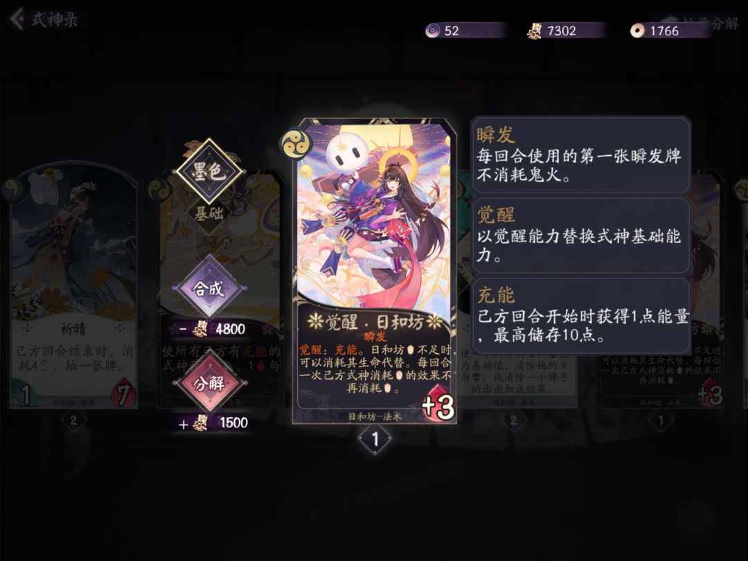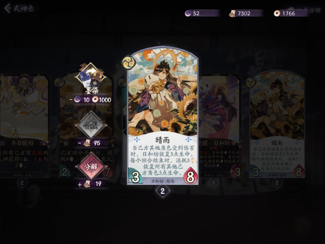 ⑤晴雨 : 后期拿来换掉滋养,不然觉醒的不耗能量会被滋养吃掉,对战狐灯的时候日和坊可以一直吃伤害。