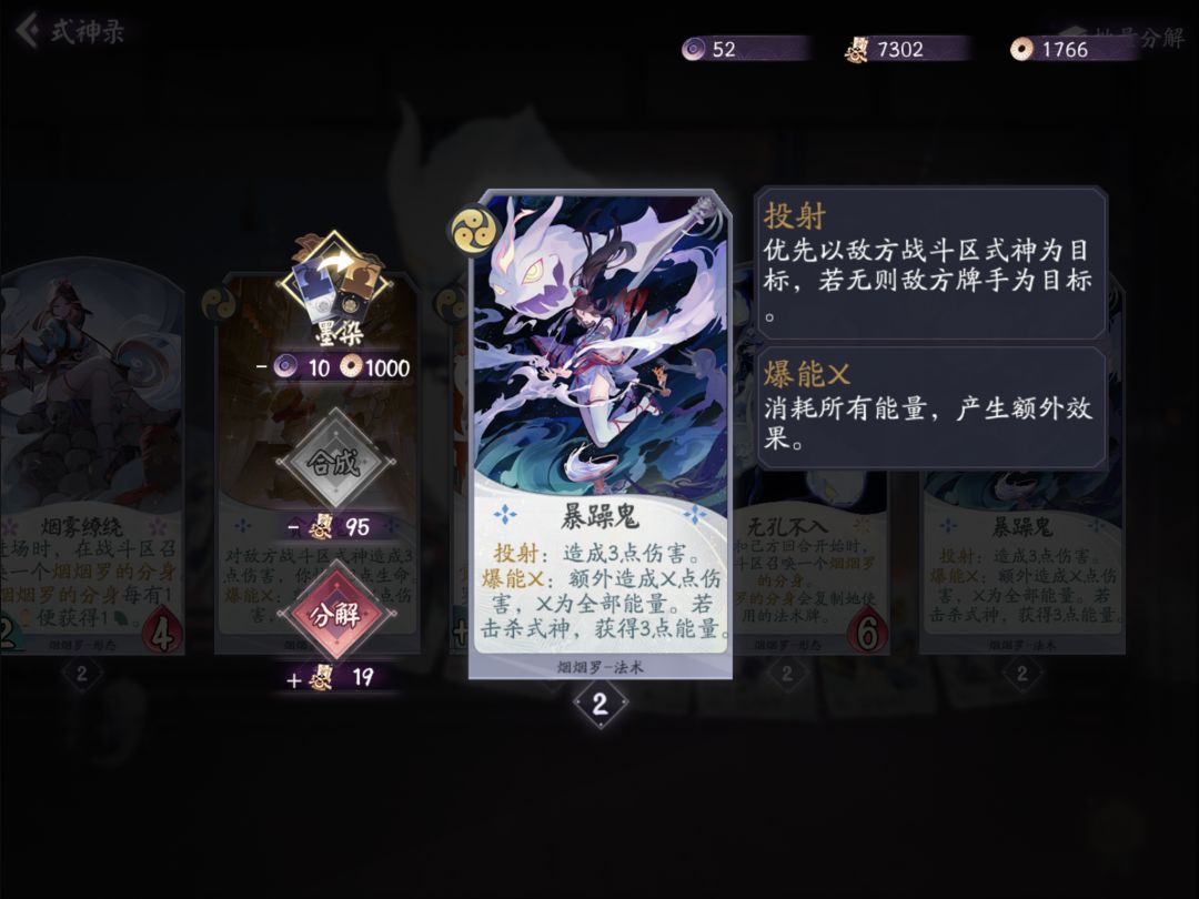 ①顽皮鬼: 一张非常强的爆能牌,二勾可以解掉几乎所有式神,是一张控场和断对方节奏的好牌。