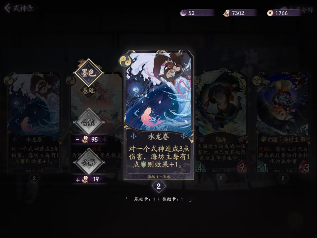 ①水龙卷: 优秀的单解牌,配合祝福之水可以打出高额点杀。可以帮助我们解掉如判官这类威胁式神抢节奏。